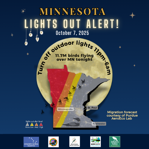 Make a big difference for migrating birds - volunteer for the Lights Out Alert Minnesota program. Contact us for more information.